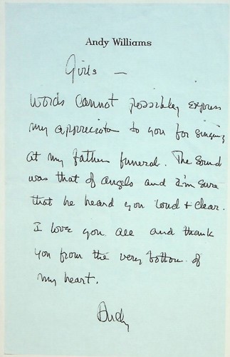 Jimmy Durante Presents the Lennon Sisters lasted only one season: the Lennon Sisters were overshadowed by Durante,[iii} and the tragic murder of their father dampened the spirit of the show.{iv} The Lennon Sisters then entered into a decade-long relationship with Andy Williams, first performing on his eponymous show, then taking up a residency in Las Vegas. When Williams’ father, Jay Emerson Williams, died in 1976, the Lennon Sisters performed at the funeral. In a note sent to the sisters, Williams wrote “Girls—words cannot possibly express my appreciation to you for singing at my father’s funeral. The sound was that of angels and I’m sure that he heard you loud + clear. I love you all and thank you from the very bottom of my heart.”